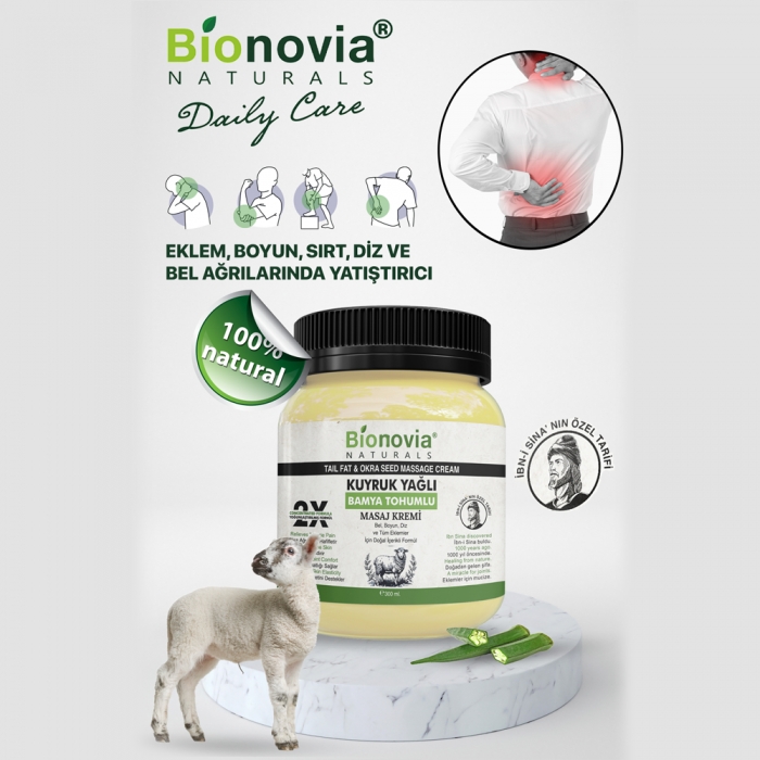 Bionovia Kuyruk Yaðlý Bamya Tohumlu Kas ve Aðrý Giderici Masaj Kremi, kas aðrýlarý, eklem rahatsýzlýklarý ve vücut gerilmeleri için etkili bir doðal çözüm sunar. Doðal içerikleri sayesinde kaslarý rahatlatýr, aðrýlarýn hafiflemesine yardýmcý olur ve yorgunluk hissini giderir. Özel formülüyle derinlemesine etki gösteren bu masaj kremi, günlük kullanýmda rahatlama saðlar.